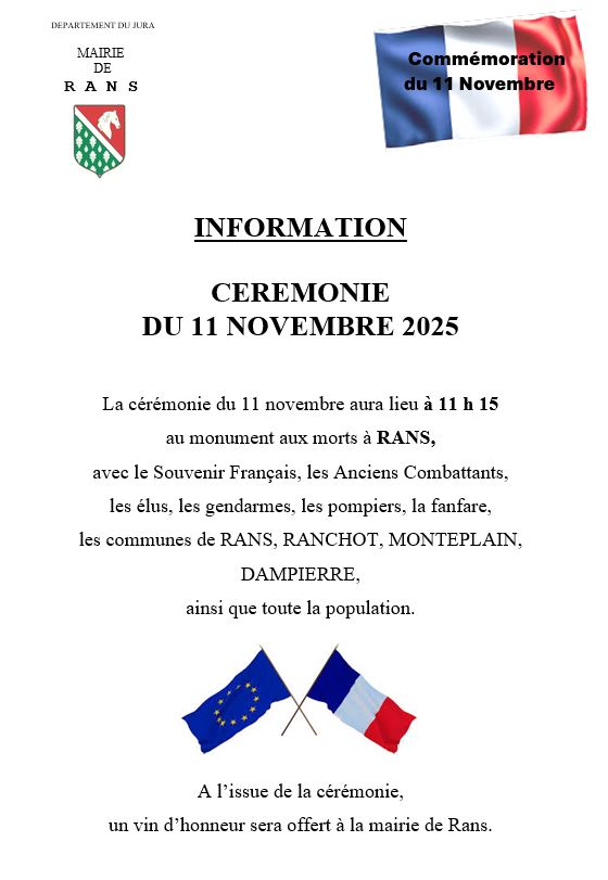 Mardi 11 novembre à 11h15, au monument aux morts à RANS.